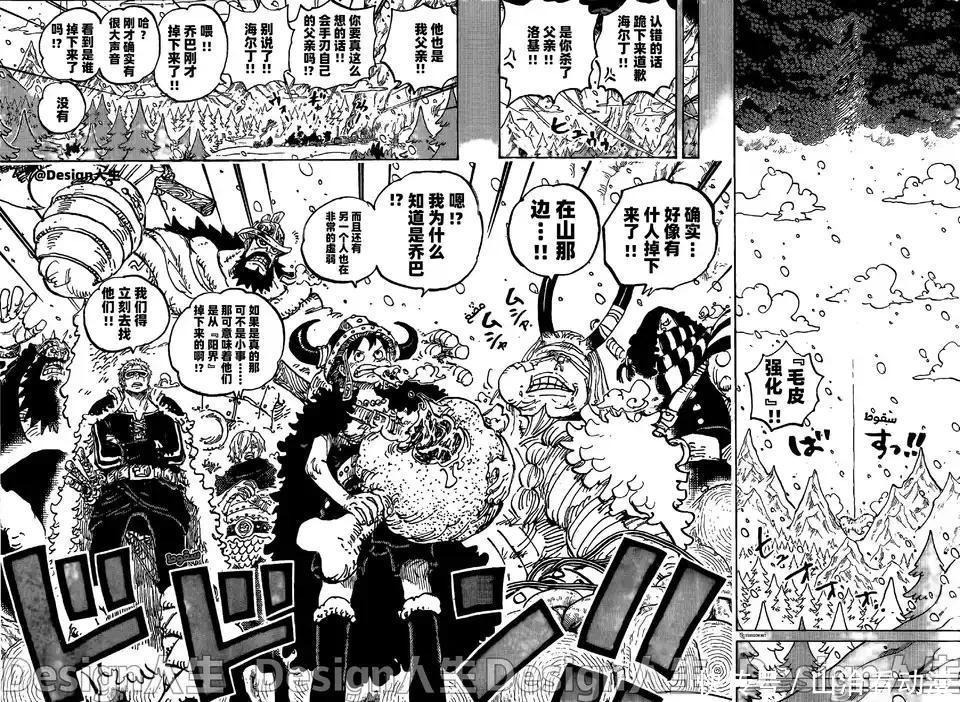 路飞和索隆,山治等人还在冥界,乔巴和贾巴掉落冥界后,他们就找到了乔巴,贾巴身负重伤,不过没有生命危险。乔巴把阳界发生的事情告诉大家,巨人族的孩子被掳走,还有一群怪物,神之骑士团就是敌人,娜美和罗宾等人被抓住了,他们还在八号森林。海尔丁等人带着草帽一伙前往阳界,他们乘坐升降梯上去,艾尔巴夫陷入一片火海当中。
